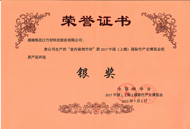 2017年7月,在中國(上海)國際竹產(chǎn)業(yè)博覽會產(chǎn)品評選中湖南桃花江竹材科技的室內(nèi)裝飾竹材榮獲銀獎。該榮譽是對桃花江竹材科技的高度認可,桃花江生產(chǎn)的室內(nèi)裝飾竹材取之天然,綠色環(huán)保,古樸自然,是有文化底蘊的室內(nèi)裝修裝飾材料,是木材的理想替代品。