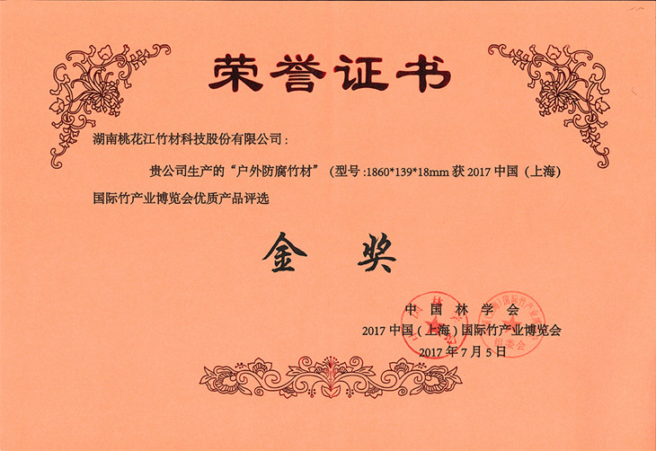湖南桃花江竹材科技股份有限公司生產(chǎn)的戶外防腐竹地板在2017年7月中國(上海)國際竹產(chǎn)業(yè)博覽會(huì)中榮獲金獎(jiǎng),該獎(jiǎng)項(xiàng)由中國林學(xué)會(huì)、中國(上海)國際竹產(chǎn)業(yè)博覽會(huì)頒發(fā)。湖南桃花江竹材科技作為中國竹材領(lǐng)域高炭防腐技術(shù)的發(fā)明者,在中國竹材領(lǐng)域有著舉足輕重的地位。湖南桃花江竹材科技一直專注與于竹材的戶外運(yùn)用研發(fā)與創(chuàng)新,為全球客戶提供優(yōu)質(zhì)竹材。