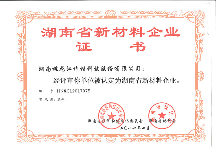2017年7月,湖南省經(jīng)濟(jì)和信息化委員會(huì)、湖南省統(tǒng)計(jì)局為湖南桃花江竹材科技股份有限公司正式頒發(fā)“湖南省新材料企業(yè)”證書(證書編號(hào):HNXCL2017075)。湖南省新材料企業(yè)的認(rèn)定,標(biāo)志著湖南桃花江竹材科技在新型竹材領(lǐng)域的成績得到國家認(rèn)可與支持,是一項(xiàng)極具含金量的突破性榮譽(yù)。作為中國竹業(yè)龍頭企業(yè),湖南桃花江竹材科技一直走在新型竹材研發(fā)、運(yùn)用和推廣的前沿,為全球竹產(chǎn)業(yè)的發(fā)展持續(xù)貢獻(xiàn)力量。
